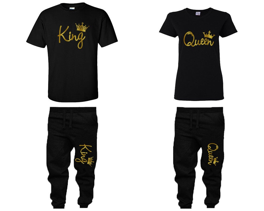 Couple king queen sweatsuits with matching t shirts, gold foil king queen jogger pants, married shirts 4 items sold separately