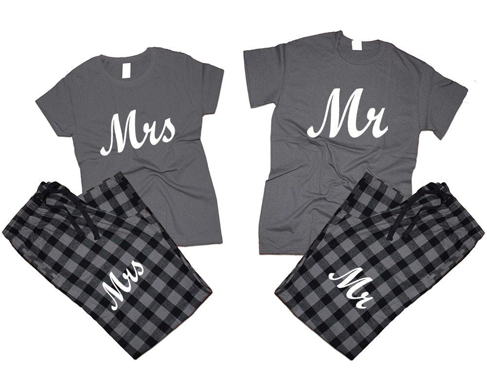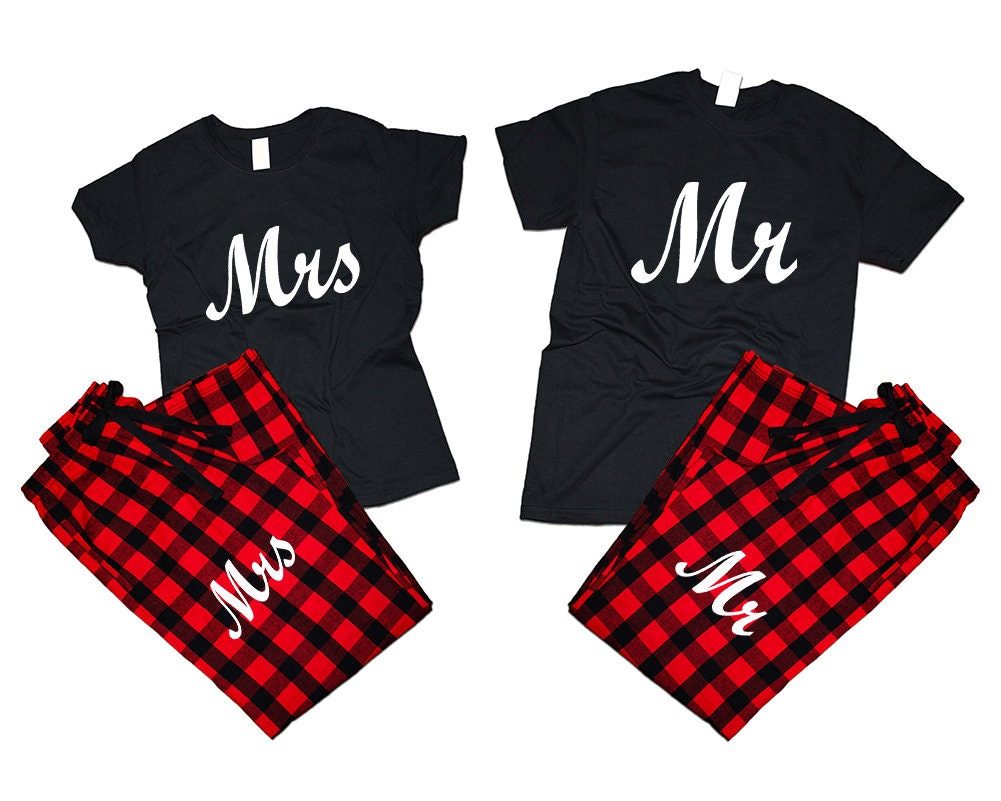 Couple Mr Mrs T shirts pajamas flannel pants outfits Christmas gift wedding anniversary vacation gift for her 4 items sold separately