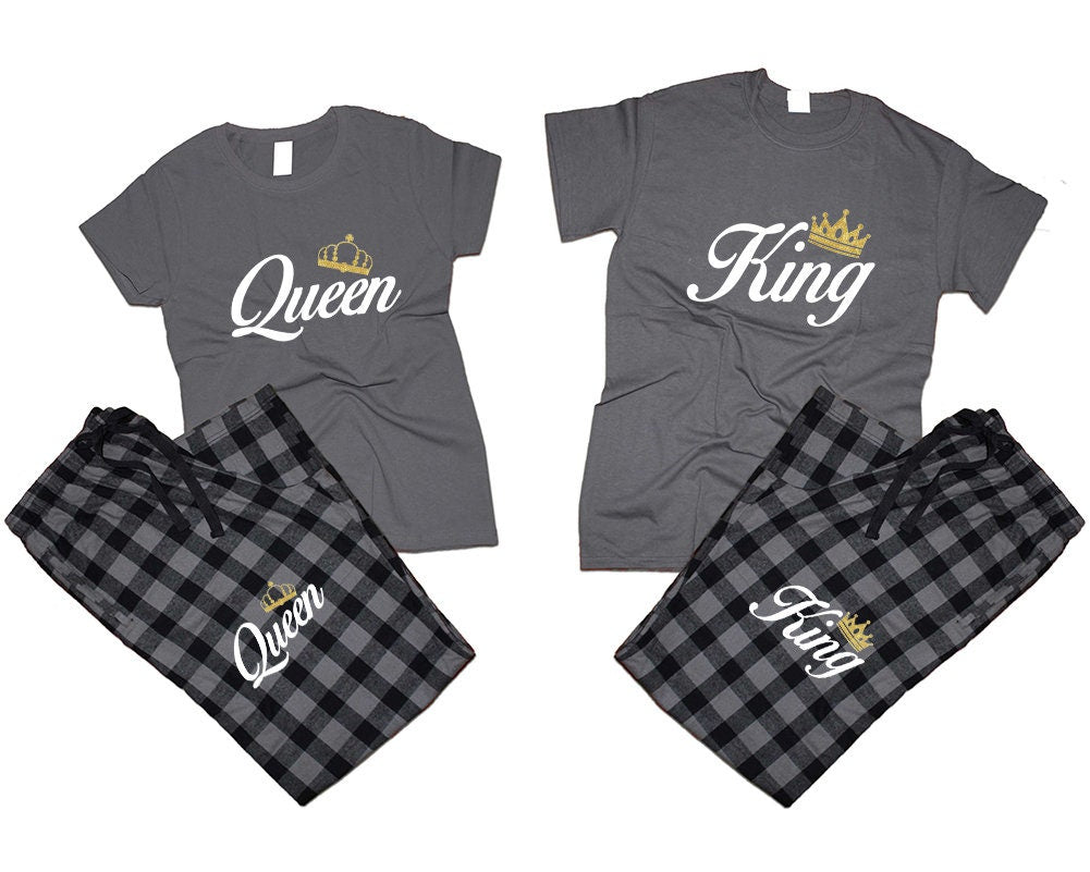 Crown King Queen gold foil pajamas Couple matching outfits flannel pants Christmas gift wedding anniversary vacation 4 items sold separately