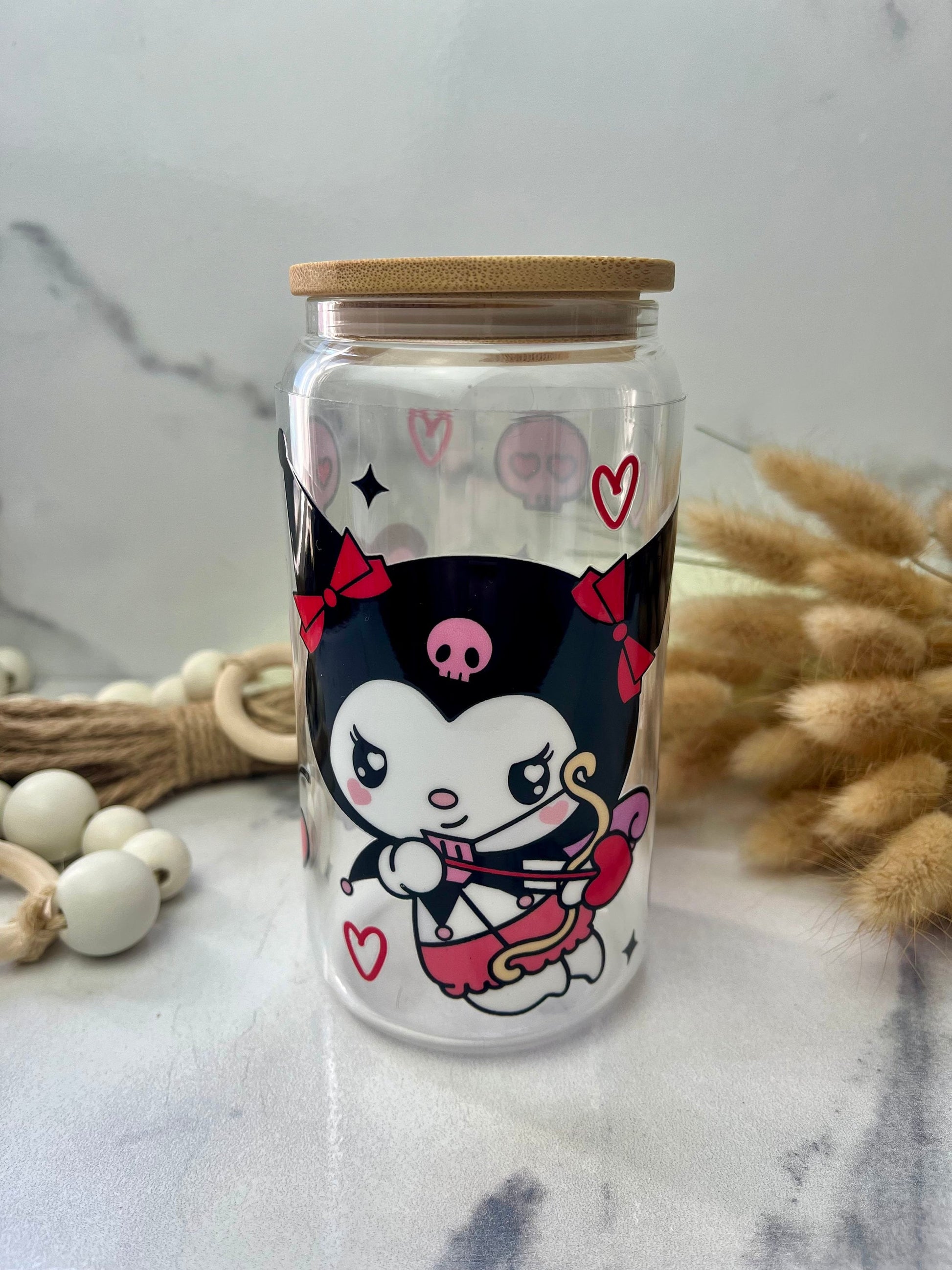 Goth Kitty, cupid kitty Glass Cup With Lid And Straw, Cute Glass Tumbler Iced Coffee Cup, Gift for her, Tumbler summer, gift for birthday