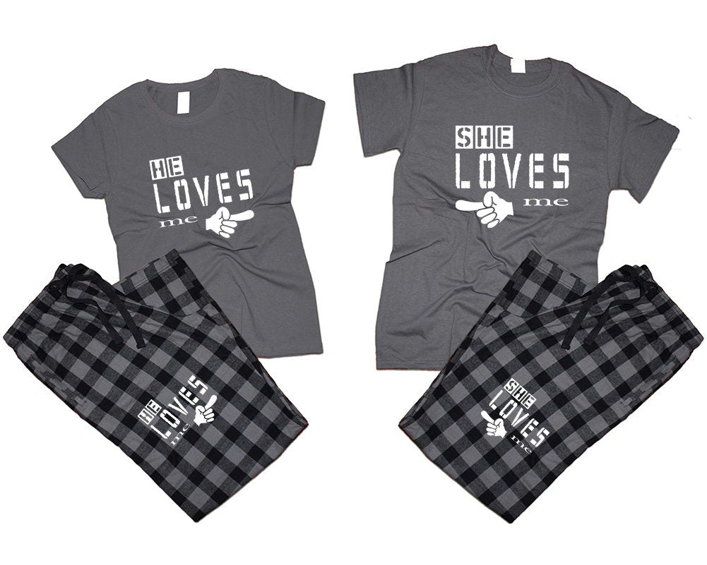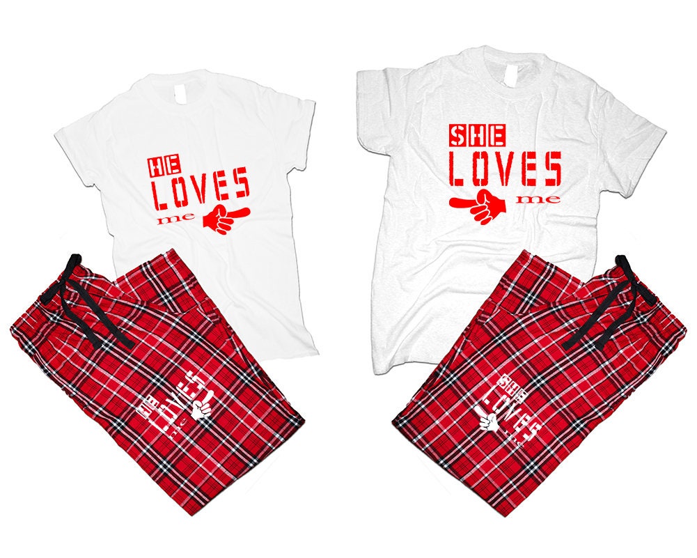 She loves me He loves me couple t shirts pajamas flannel pants Christmas gift wedding anniversary vacation 4 items sold separately